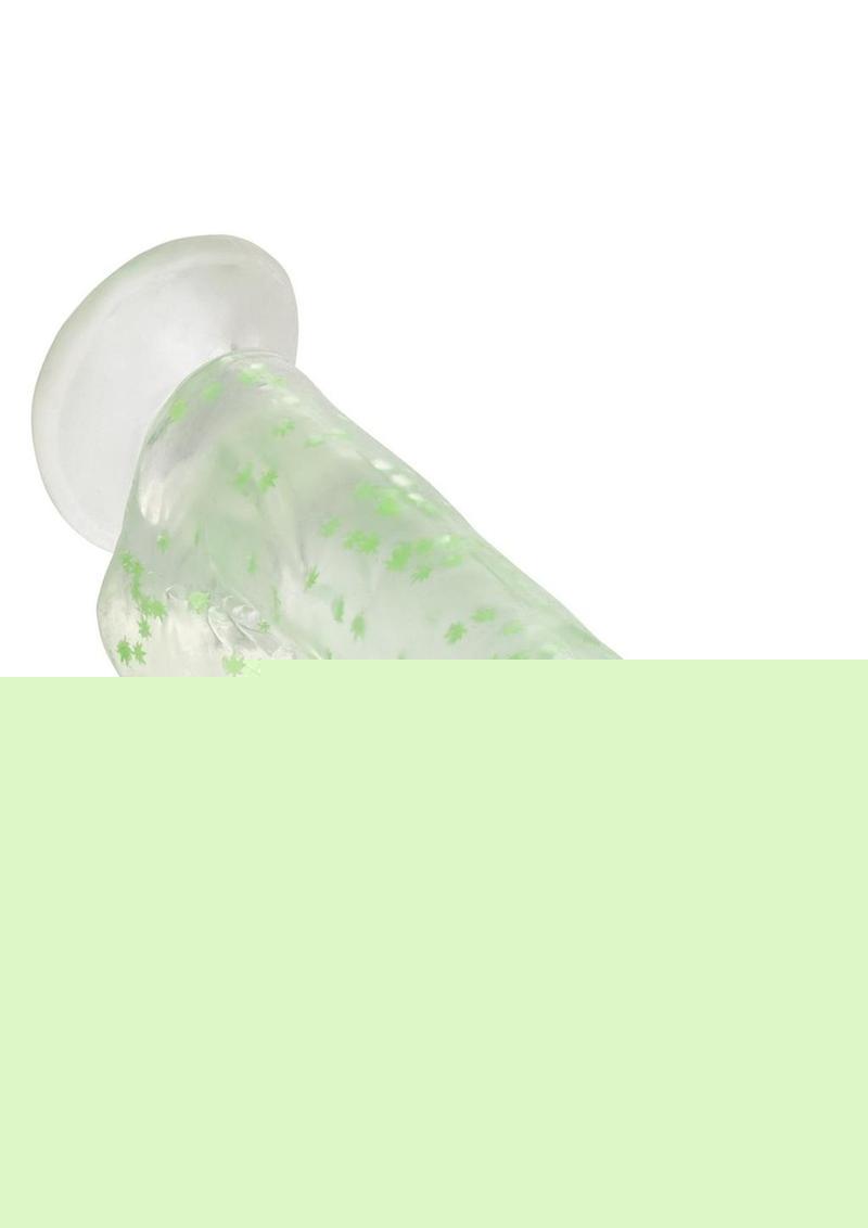 A fully loaded smoke show! Weed leaf filled, glow-in-the-dark dong with firm, life-like feel. Extremely flexible design. Harness compatible. Sturdy suction cup base.