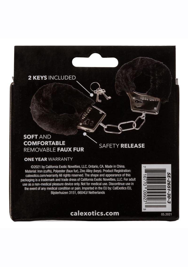 Metal faux fur covered handcuffs with safety release. Soft and comfortable removable faux fur. 2 keys included.