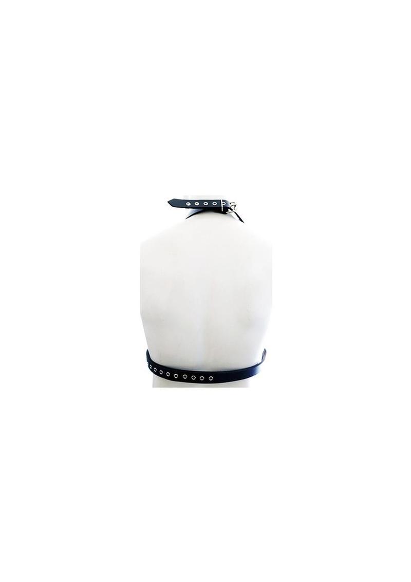Leather female chest harness made of high quality leather. Adjustable buckle closure and finished off with flat riveted studs along the straps.