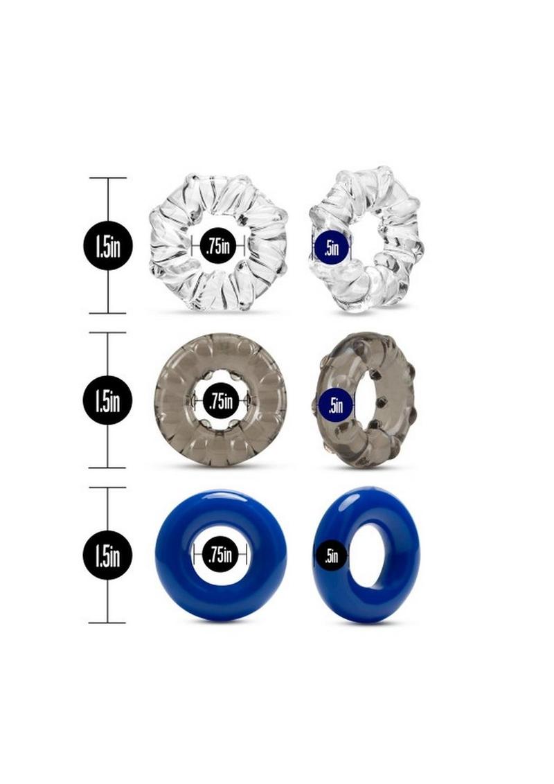 Play hard, play comfortable! The Stay Hard Triple Stretch 3 Pack Cock Rings gives you three rings that all feel good, look sexy. Get instant results. Longer, harder erections. Increase stamina. Give you and your partner longer and more intense orgasms. Add size, girth. lengthen your dick. They are also stretchy, easy to put on, super comfortable, and reusable. Made of premium TPE, they're phthalate-free and simple to clean. Pack of 3 penis rings each measuring .5" Thick x 1.5" Outer Width x .75" Inner Width. Lab tested body safe. Silicone, water based, hybrid lube compatible.
