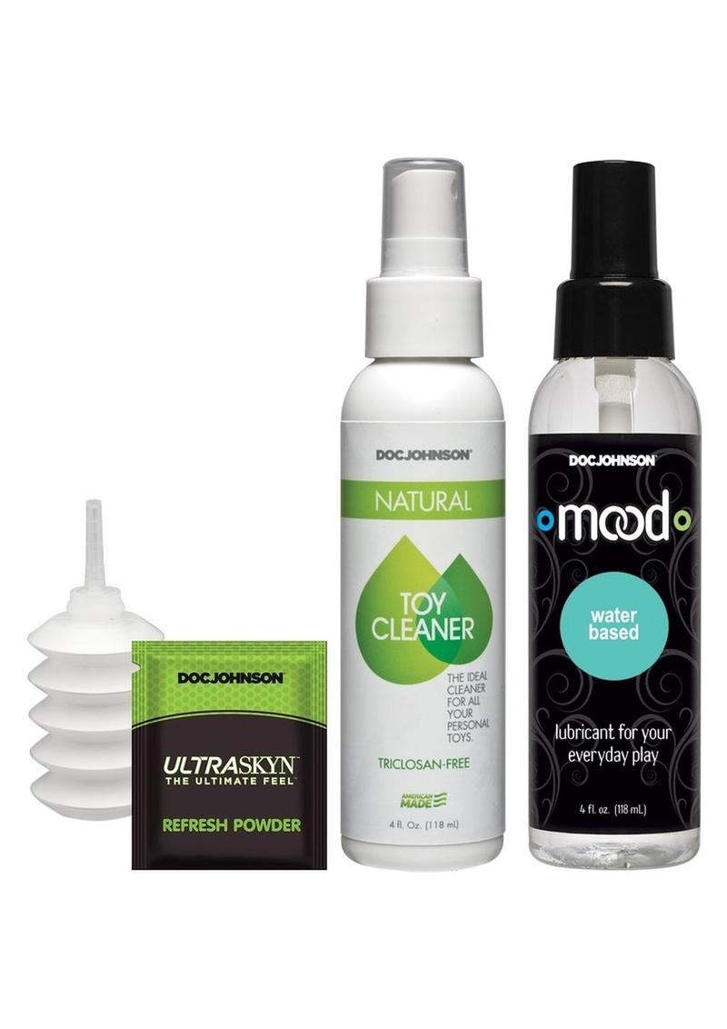Your perfect strap-on experience is on lock with Doc Johnsonb s deluxe line of full-service Vac-U-Lock Harness Sets. The Vac-U-Lock Dual Density ULTRASKYN Set is a solid investment for upgrading or beginning your strap-on accessories collection, offering multiple options in one box via a complete harness with removable o-rings and plug, three ULTRASKYN attachments, and a bottle of Mood water-based lube. These lifelike dual density attachmentsb an 8b Realistic Dong, a 7b Cock, and the bestselling 7b Slim Cock-- warm to body temperature with use and feature a soft, pliable exterior that gives way to a firm inner core, recreating the feel of a real erect penis. Attachments can be used with the harness, the included Vac-U-Lock suction cup, and any other accessory or harness in the line. The Vac-U-Lock Dual Density Starter Set also includes Doc JohnsonB. Natural Toy Cleaner and ULTRASKYN Refresh Powder to properly and hygienically maintain your dual density ULTRASKYN attachments. Every product in the patented Vac-U-Lock system is designed to help you create any strap-on or toy youb re in the mood for, and itb s as simple as popping on the attachment of your choice.